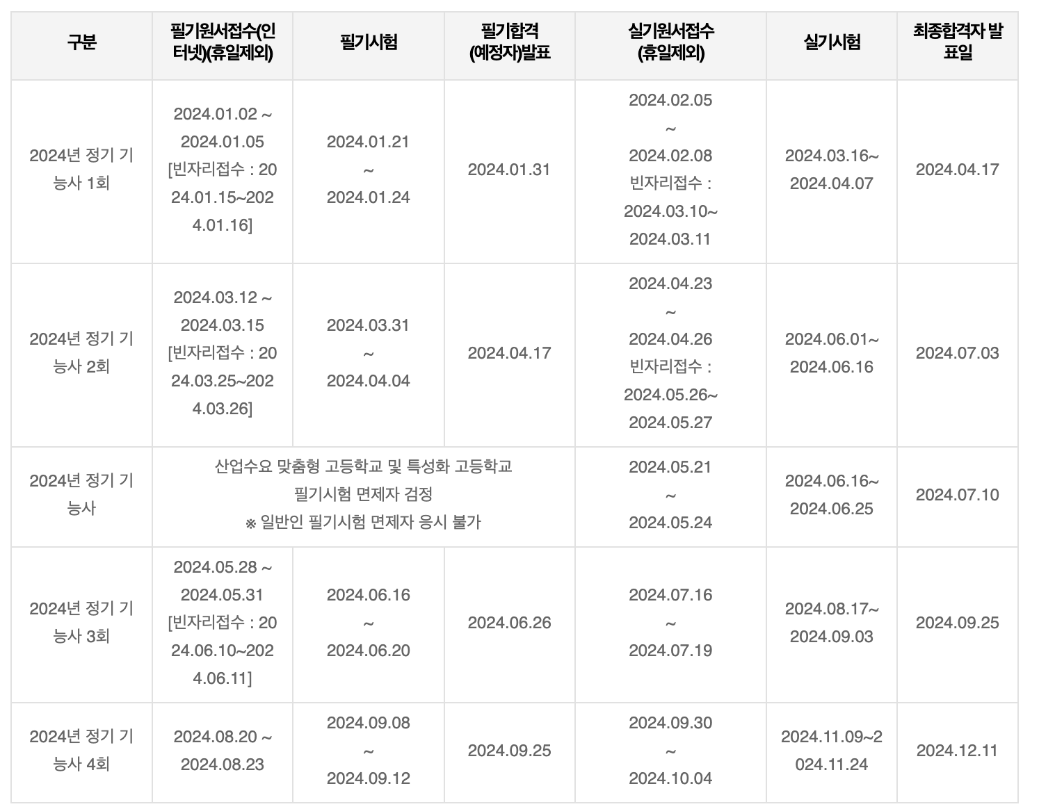 | 회차 | 필기시험 원서접수 | 필기시험 | 실기시험 원서접수 | 실기시험 |
